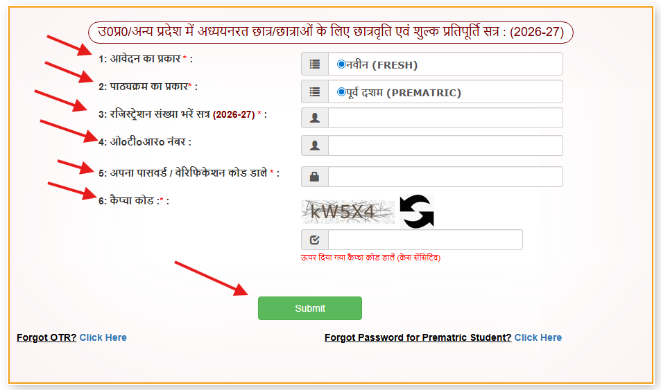 स्टेप 4:- यहाँ पर आप आवेदन प्रकार, और पाठ्यक्रम एक बार सुनिश्चित करले और फिर अपनाRegistration Number चल रहे छत्र के अनुसार दाखिल कर। इसके अलावा OTR नंबर , पासवर्ड और captcha कोड डाल कर Submit पर क्लिक करे।