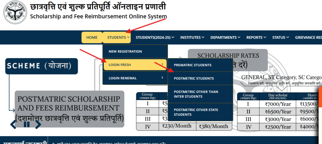 स्टेप 2:- यहाँ पर student वाले menu में जाए और फिर Login Fresh पर क्लिक करके submenu में अपनी class के अनुसार आवेदन में आगे बढ़े।